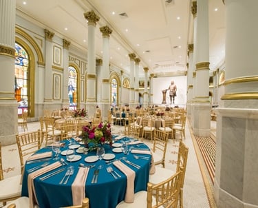 The room is majestic and the ancient architectural details are breathtaking. Navy sequined tablecloths set off the starry sky carved into the glass ceiling above, while peacock green and gold accents complement the gorgeous stained glass windows to create a breathtaking atmosphere.