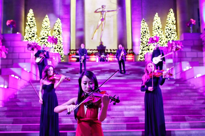 After the staircase performance, guests were invited upstairs to enjoy dinner at long tables arranged in a U-shape around the balcony. The band continued to play holiday classics during dinner. Guests returned to the grand staircase hall for dessert and danced the night away to a band that blended soul, blues, R&B, funk and rock. As expected, the band kept guests on the dance floor all night, chanting “Encore!” until the end.